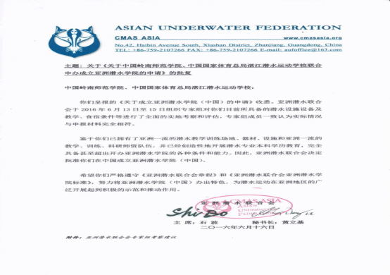 高起点:学院创办获世界潜水联合会支持与亚洲潜水联合会授权,赢得国家体育总局、广东省和湛江市支持。