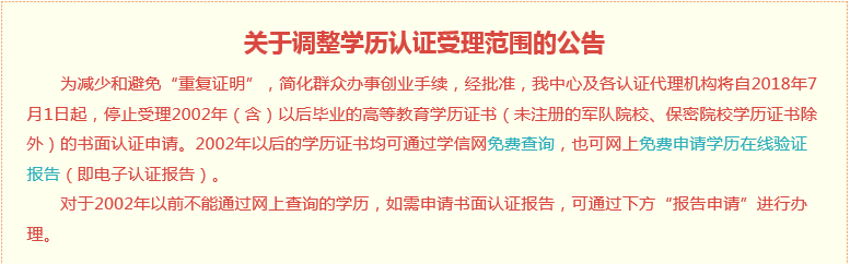 为减少和避免“重复证明”,简化群众办事创业手续,经批准,我中心及各认证代理机构将自2018年7月1日起,停止受理2002年(含)以后毕业的高等教育学历证书(未注册的军队院校、保密院校学历证书除外)的书面认证申请。2002年以后的学历证书均可通过学信网免费查询,也可网上免费申请学历在线验证报告(即电子认证报告)。