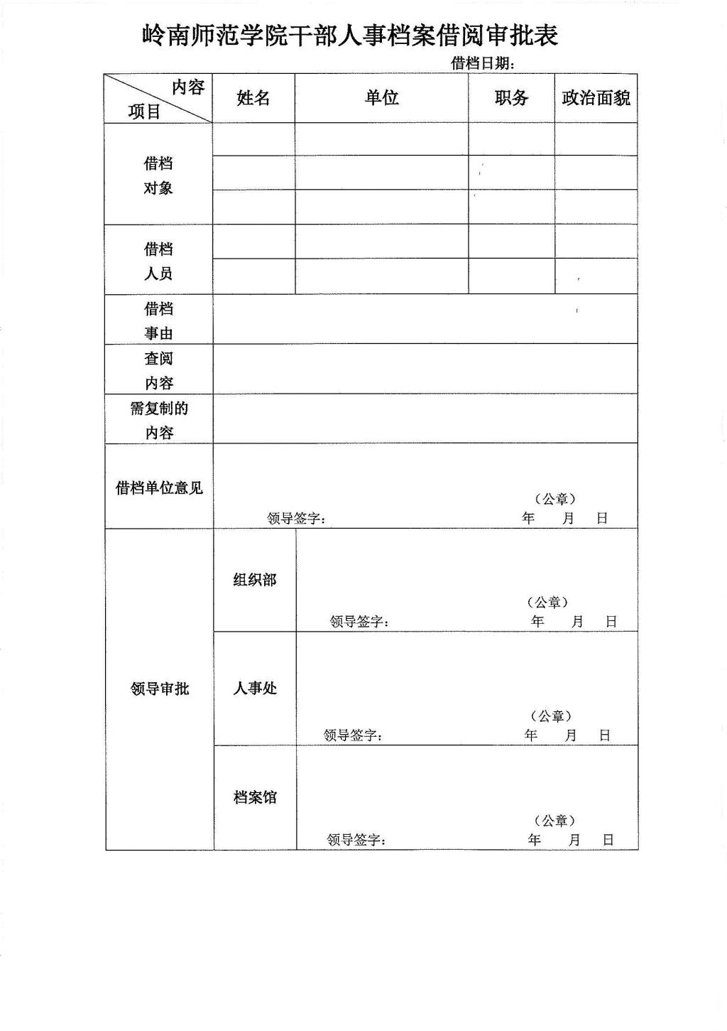 岭南师范学院干部人事档案借阅审批表.doc