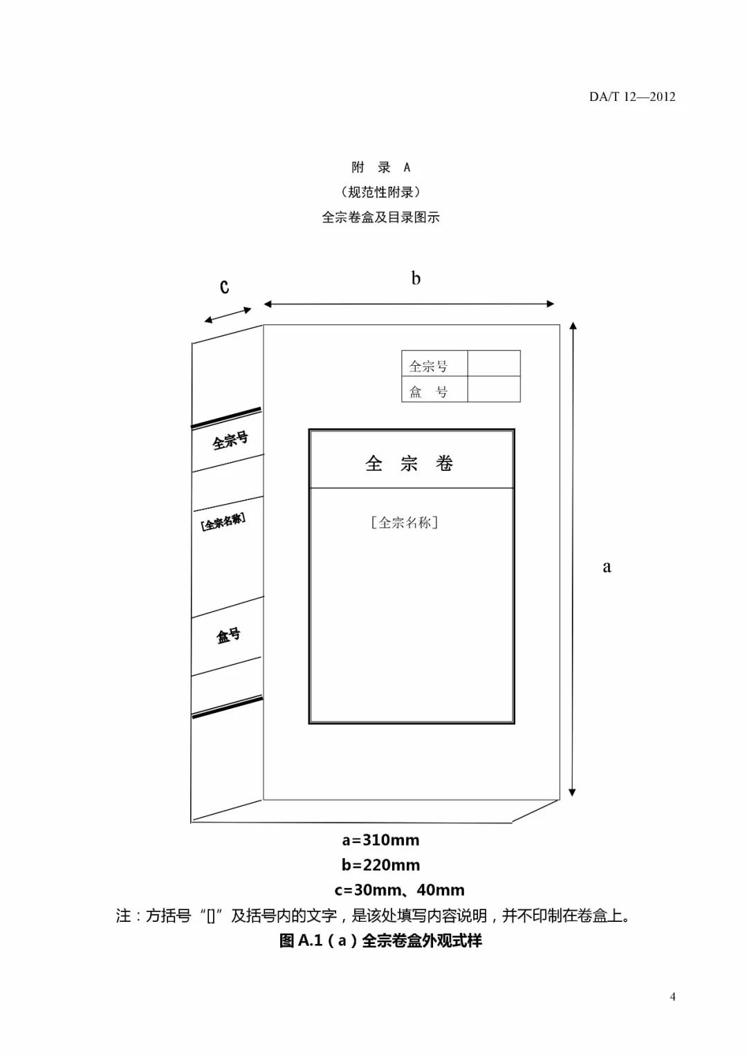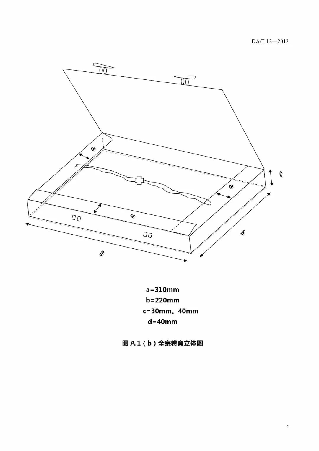 8.1 全宗卷装具采用无酸纸制作的翻盖式卷盒。封面与脊背分别设置“全宗号”、“全宗名称”、“盒号”等填写项目,卷盒的外形尺寸为310mm×220mm(长×宽),盒脊厚度为30mm、40mm两种规格。卷盒式样见图A.1。