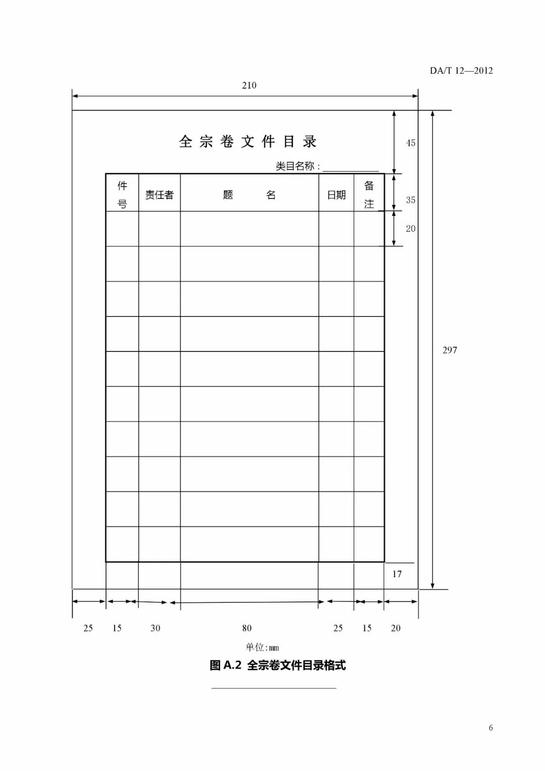 8.2 全宗卷文件目录采用A4(长×宽为297mm×210mm)纸张、表格形式,设置“类目名称”、“件号”、“责任者”、“题名”、“日期”、“备注”等项目。目录式样见图A.2。