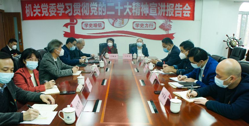 12月14日下午,机关党委举行学习贯彻党的二十大精神宣讲报告会。学校党委书记兰艳泽、校长阳爱民与机关党委委员、纪委委员以及党委办公室党支部、院长办公室党支部全体干部职工在主会场二号会议室参加报告会。