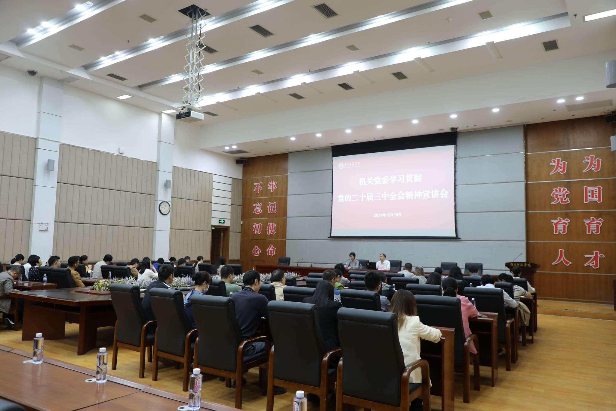 10月30日上午,机关党委在国际会议厅举办学习贯彻党的二十届三中全会精神专题宣讲会,学校党委理论宣讲团成员、马克思主义学院副院长施保国教授作党的二十届三中全会精神专题宣讲。宣讲会由机关党委副书记刘天明主持。