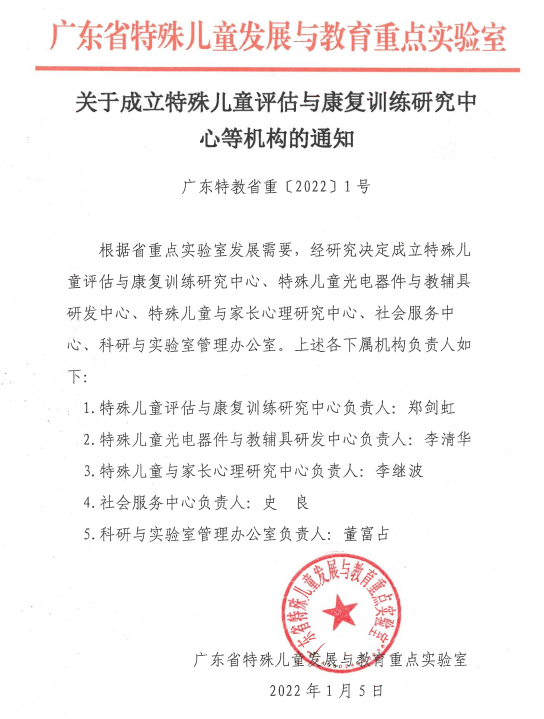 根据省重点实验室发展需要,经研究决定成立特殊儿童评估与康复训练研究中心、特殊儿童光电器件与教辅具研发中心、特殊儿童与家长心理研究中心、社会服务中心、科研与实验室管理办公室。上述各下属机构负责人如下: