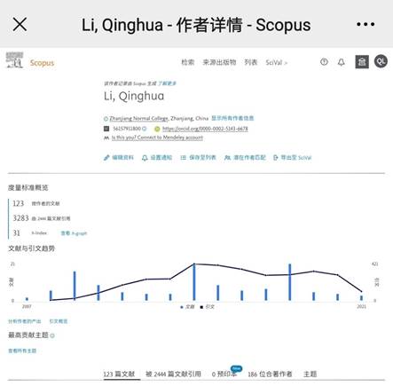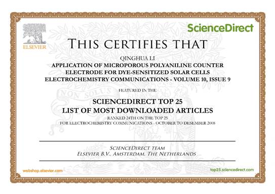 近日获悉,我校李清华教授以第一作者发表于“Electrochemistry Communications”期刊(中科院一区,Top期刊)的学术论文被ScienceDirect数据库评为高下载排名TOP 25,截至目前,该论文SCI引用已超400次,被列入ESI高引论文(被引次数位于TOP 1%)。此外,全球权威的引文与索引数据库Scopus的中国学者科研成果统计显示:李清华教授已发表SCI学术论文123篇,总引用次数为3283次,H指数达31。