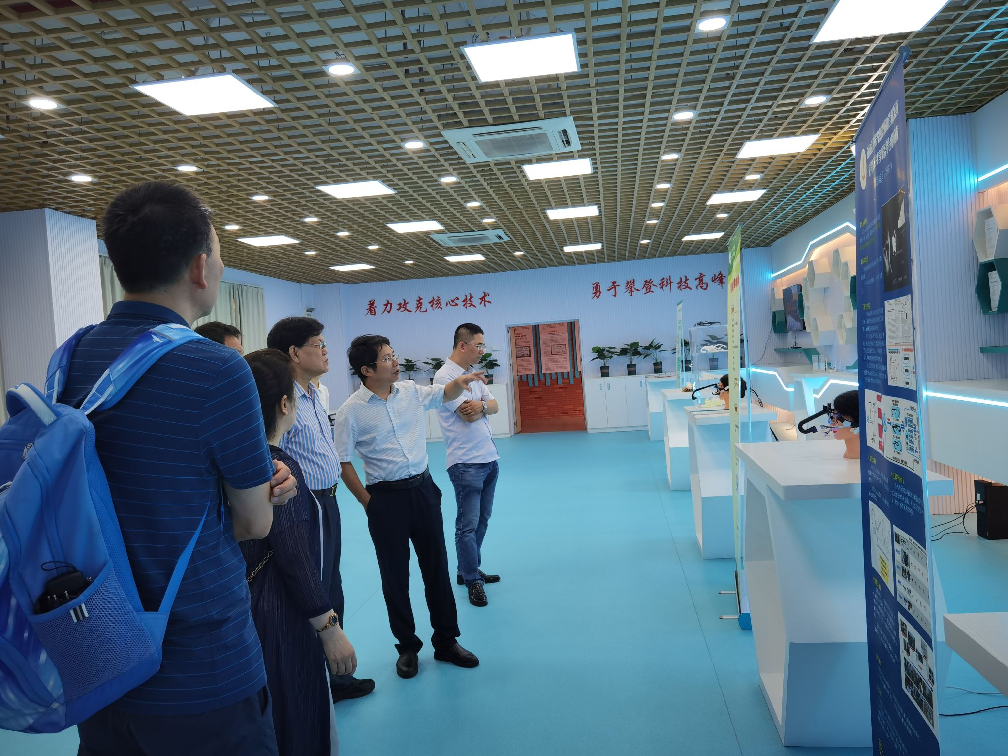 2023年9月16日上午,参加完广东省心理学会儿童、青少年心理援助专业委员会换届会议的广东省心理学会会长张敏强教授和副会长黄钢教授在广东省特殊儿童发展与教育重点实验室常务副主任郑剑虹教授的陪同下,参观考察了省重点实验室特殊儿童光电器件与教辅具研发中心、特殊儿童与家长心理研究中心、特殊儿童家长服务中心、特殊儿童评估与康复训练研究中心、岭师教育康复部以及特殊儿童光干预实验室、近红外光学脑成像实验室等。