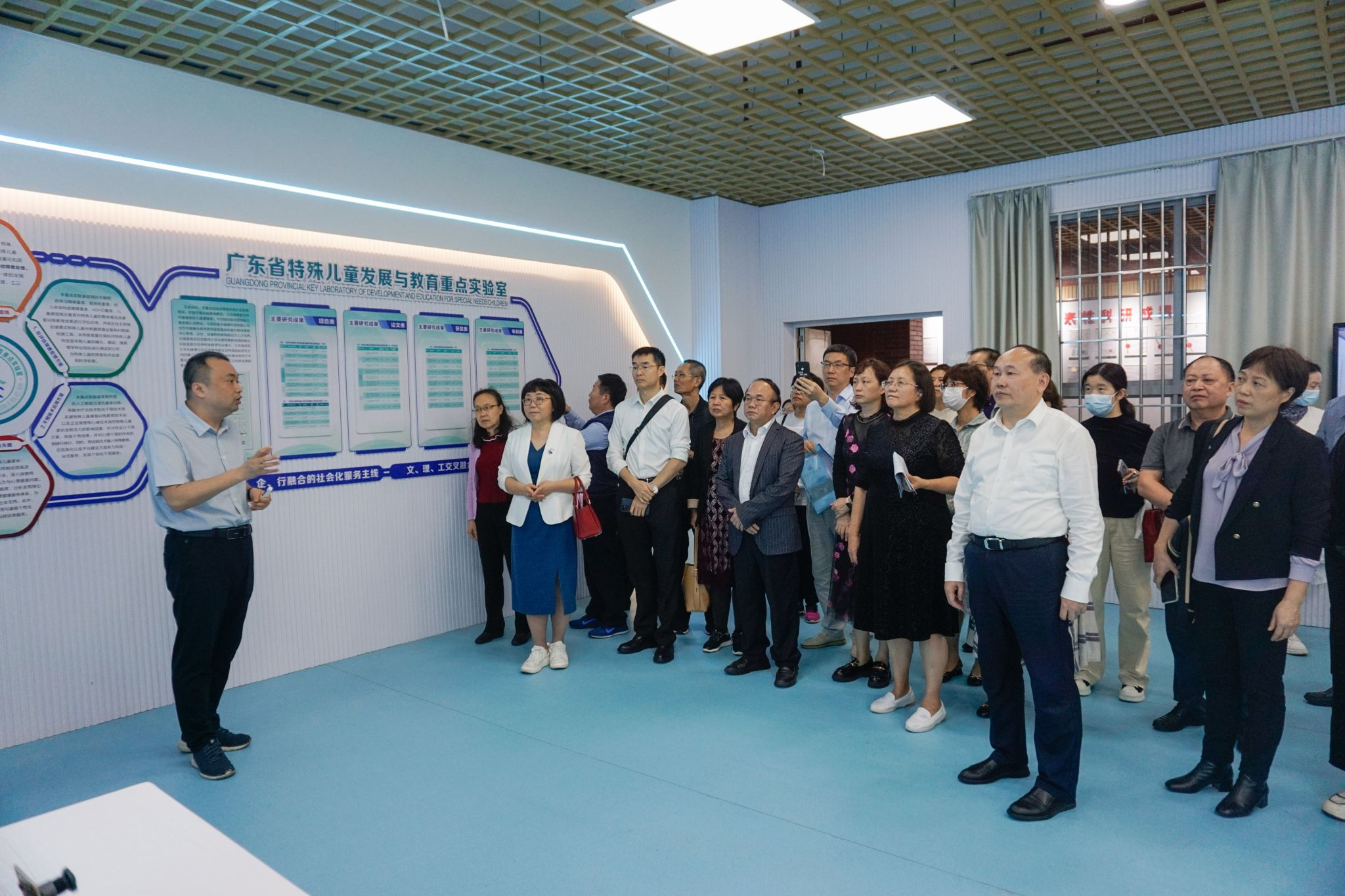 11月30日下午,广东省高校医疗保健协会常务理事单位莅临省重点实验室参观调研,学校校长阳爱民、省重点实验室常务副主任郑剑虹教授、省重点实验室副主任李清华教授等人陪同。参观考察了省重点实验室特殊儿童光电器件与教辅具研发中心、特殊儿童与家长心理研究中心、特殊儿童家长服务中心、特殊儿童评估与康复训练研究中心、湛江市残疾人康复中心岭师教育康复部以及特殊儿童光干预实验室、近红外光学脑成像实验室等。尤其对省重点实验室的眼动仪辅助评估筛查系统以及特殊儿童干预与康复训练个性化服务平台进行了详细了解。省高校医疗保健协会常务副会长、秘书长胡悒萍对省重点实验室目前的科研成果给予了充分的肯定。