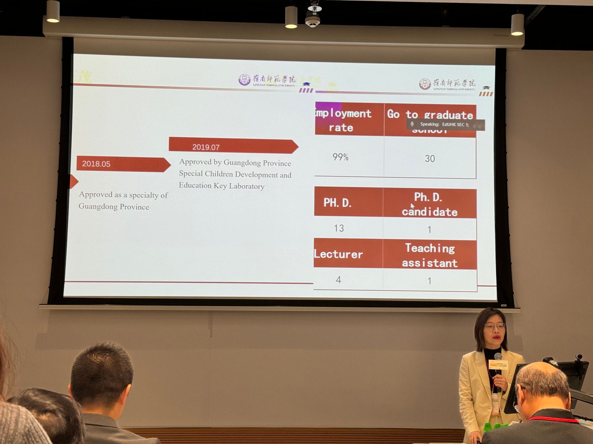 下午,与会人员分成九个小组,围绕特殊学校、非政府机构和教育科技等各个领域进行热烈讨论,杨洁博士以《岭南师范学院特殊教育专业人才培养的实践探索》为题目在分组讨论中做演讲。