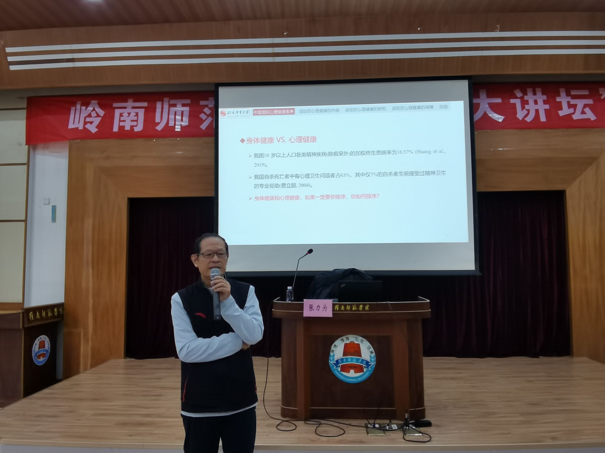 12月23日,应省重点实验室邀请,北京体育大学张力为教授做客“雷阳大讲坛”,在图书馆学术报告厅为师生带来了一场题为《运动员的艰辛历程与心理健康》的精彩学术讲座。讲座由李继波教授主持,心理系和运动康复专业师生120余人聆听讲座。