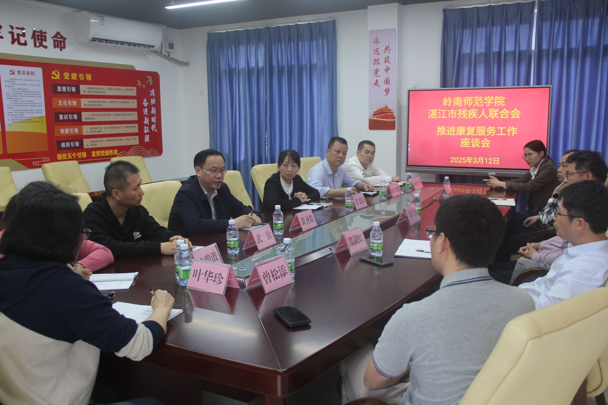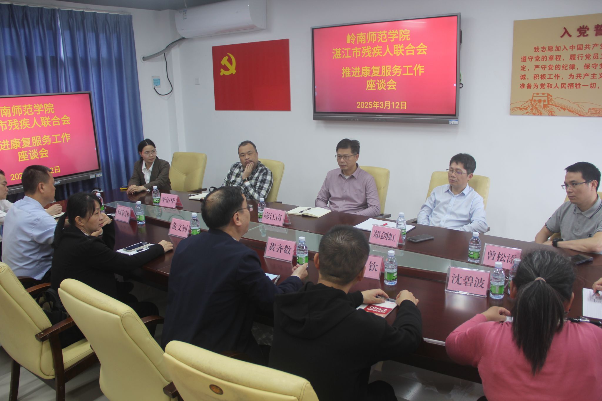 3月12日下午,岭南师范学院和湛江市残联在市残疾人康复中心召开推进康复服务工作座谈会,研究交流发挥各自优势和作用,不断提升残疾人康复服务水平,为残疾人提供更优质、更高效的康复服务。华南师范大学帮扶队队长廖江南,岭南师范学院广东省特殊儿童发展与教育重点实验室常务副主任郑剑虹、副主任李清华,市残联党组成员、副理事长黄文钊、黄齐数,以及市康复中心有关负责同志和技术骨干参加座谈交流。
