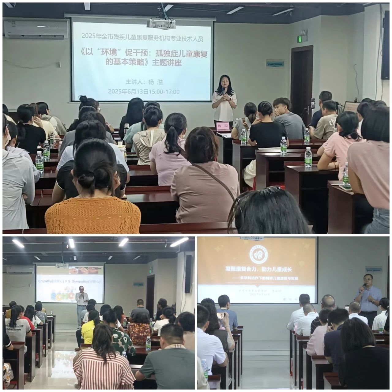 为推动我市残疾儿童康复事业高质量发展,加强康复服务机构规范化建设和服务效能提升,在市残联指导下,市残疾人康复中心与岭南师范学院合作成立了岭师特殊教育专业研究生实践基地、重点实验室研究基地、重点实验室孤独症儿童干预研究实践基地和重点实验室家长服务基地。同时依托基地,双方合作启动了2025年春季学期培训计划,从5月16日开始,每周五面向全市儿童定点康复服务机构开展专题讲座,并在网络平台同步直播。据统计,线上线下参加共569人次。
