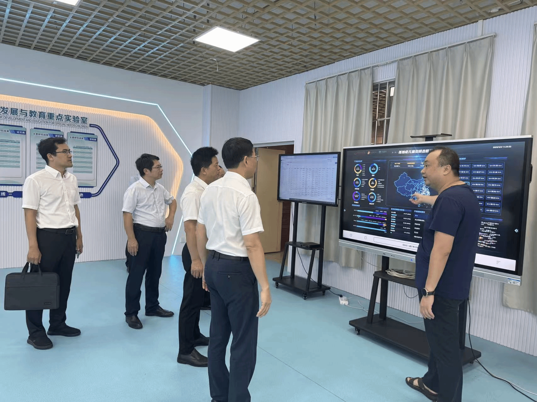 郑剑虹代表实验室对李更盛一行的到来表示热烈欢迎,李清华围绕实验室建设历程、科研成果与社会服务等方面作了系统汇报。在特殊儿童光辅助仪器与数字化服务中心,李清华重点介绍了实验室在特殊儿童早期筛查与干预、光辅助康复技术、人工智能大数据平台构建等方面的创新突破,及其在普惠教育中的应用效果。实验室针对自闭症及其他特殊儿童的多维数据管理和实时监控平台引起了调研组的高度关注,李更盛认为该平台为提升特殊教育质量提供了坚实的技术支撑。