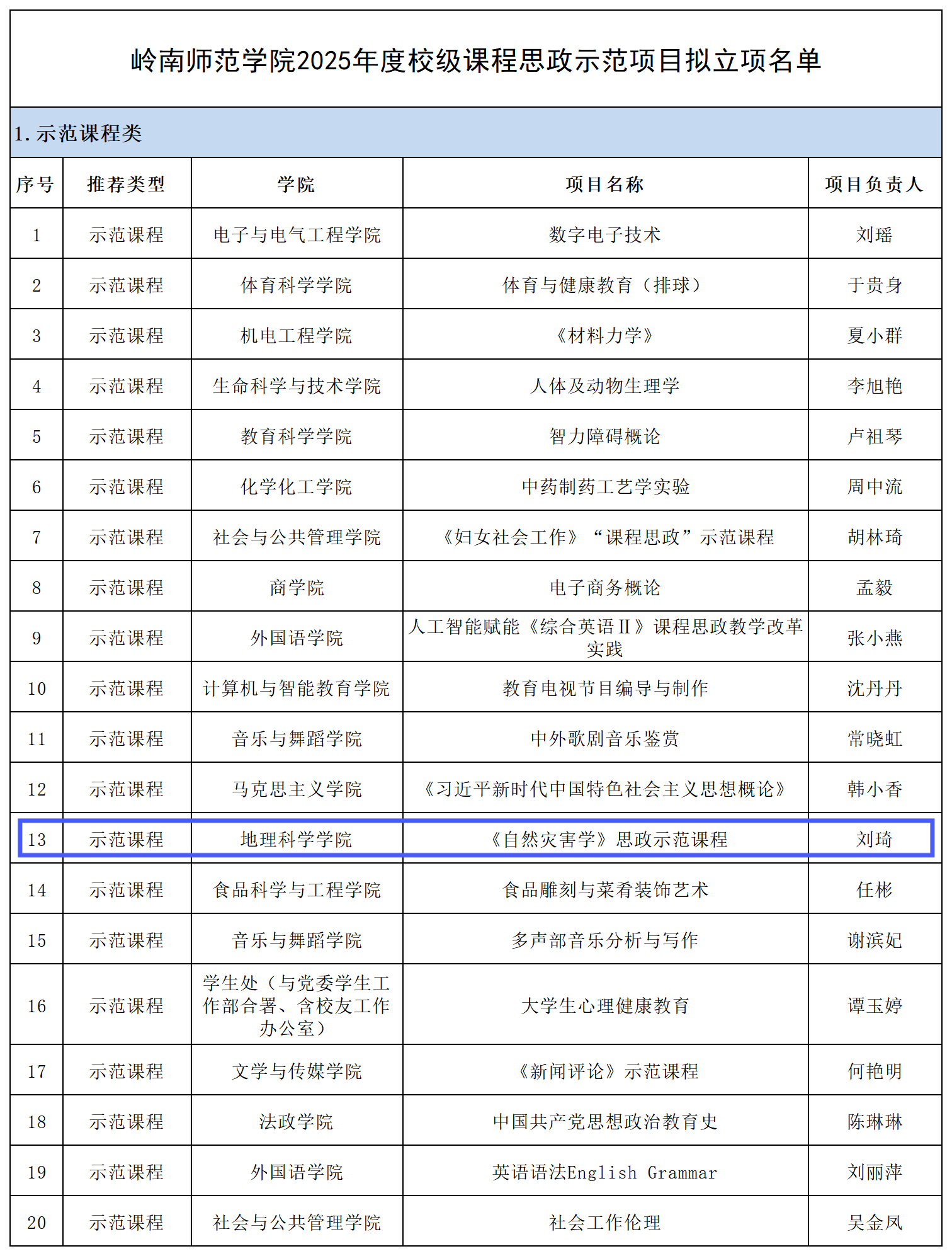 根据《关于公布2025年度校级课程思政示范项目评选结果的公示》(教务〔2025〕75号),在岭南师范学院2025年度校级课程思政示范项目拟立项名单中,我院刘琦老师的《自然灾害学》思政示范课程获得立项!