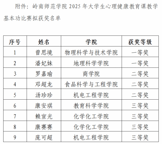 根据《关于岭南师范学院2025年大学生心理健康教育课教学基本功比赛拟获奖名单的公示》(学生〔2025〕45号),在2025年大学生心理健康教育课教学基本功比赛中,我院潘妃妹老师荣获一等奖!