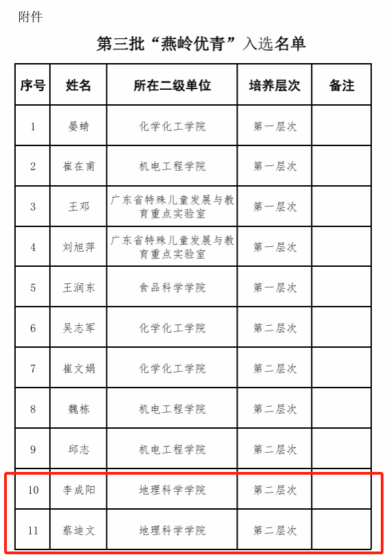 根据《岭南师范学院“燕岭优秀青年教师培养计划”实施办法》(岭师人事〔2019〕437号)和《关于做好第三批“燕岭优秀青年教师培养计划”培养对象推荐遴选工作的通知》(人事〔2024〕35号),经个人申请、所在二级单位评议推荐、职能部门审核、校人才工作委员会评议、校长办公会和党委常委会审议,拟遴选岭南师范学院第三批“燕岭优青”培养对象11人(名单见附件),其中我院两位优秀教师——李成阳老师与蔡迪文老师,成功入选岭南师范学院第三批“燕岭优青”人才培养计划!现予以公示。公示时间从2025年5月9日至5月13日止。