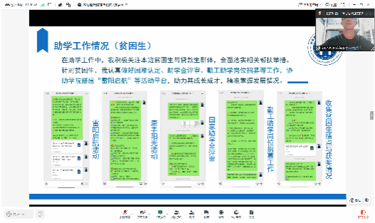本次活动主要由副班演讲、评分及发言环节组成。在副班演讲环节,多数副班以共享PPT的形式,围绕个人助学工作情况与受助学生相处工作总结与反思等的经验和成果展开分享,展现出副班们积极的工作态度和出色的工作能力,同时交流了工作中遇到的难点问题及解决路径。在综合考评环节中,嘉宾及观众们在每位副班演讲结束后,通过微信群内的评分链接对选手的演讲表现进行打分,后续由干部结合综合得分评选出优秀副班。