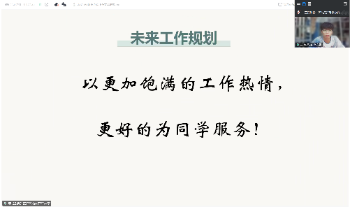 会议尾声,勤工与心康服务中心秘书长潘雨桐总结了活动宗旨,肯定副班在对接工作、服务困难学生中的关键作用,点赞其细心严谨、经验分享与创新实践,同时期待各位副班在本次活动中借鉴到其他副班的闪光点,积极改进工作。最后感谢副班们对学院勤工服务中心工作的支持,希望大家延续工作热情与初心,与各班委密切配合,持续提升班级建设水平。主持人姚雪泳总结道:“本次活动不仅展现了副班们的风采与能力,更为班级发展注入了新的活力。让我们携手共进,为班级的发展而努力奋斗。”