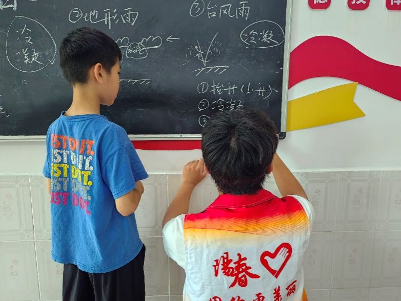 2022级地理2班的曾祥安同学在阳春市春湾镇文化站参加为期五天的暑期志愿者活动。活动期间,曾祥安同学报名暑期作业班的小学生进行作业辅导,针对数学、语文等学科的不同问题,灵活调整教学方式,如借助实物道具讲解数学概念、引导孩子们从文章结构入手分析语文阅读理解。同时,还结合自身地理科学专业,开展了“科学与生活常识”课堂分享,选取典型地貌、天气与天文现象等内容,通过绘制示意图、播放视频等方式,激发孩子们的兴趣并鼓励他们提问与讨论。曾祥安同学表示,当代青年也能用专业能力回馈社会。他寄望未来能继续做教育星火的传递者,用微光照亮更多成长之路。