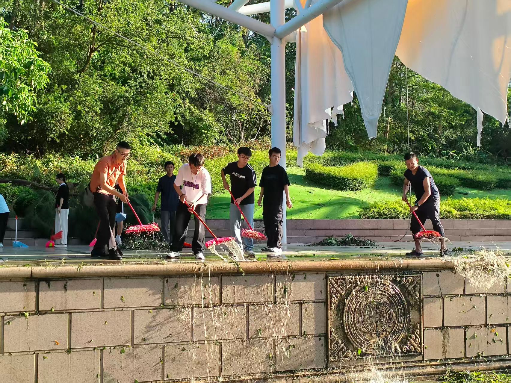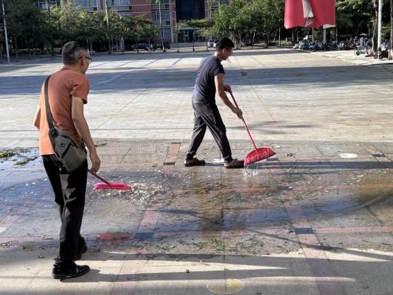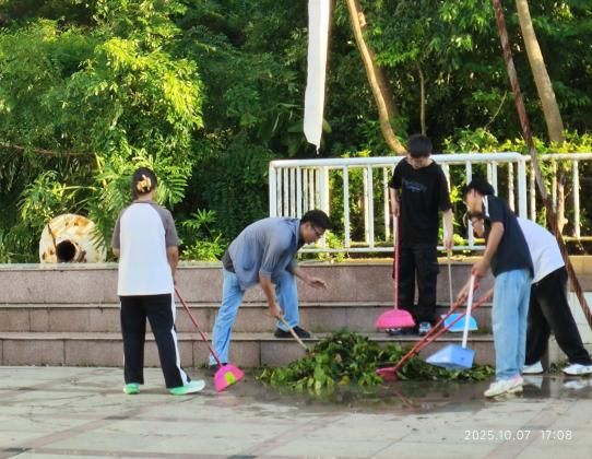 在清扫现场,学院领导与志愿者们一同劳动,全程参与,手持清洁工具,不时指导清理工作,带领大家清理路面。师生志愿者们分工协作,配合默契,有的负责清扫落叶与扶起倒地的车辆,有的搬运树枝,有的清除低洼处积水。虽然天气炎热,汗水浸湿了衣衫,但大家干劲十足,劳动热情高涨。学院领导在劳动过程中向志愿者们表示:“这次清扫行动,正是我们劳动教育课程的一部分。”他们希望同学们能通过这样的实践,深刻理解劳动的价值,并将这份不畏辛苦、团结协作的精神带到未来的学习与生活中去。