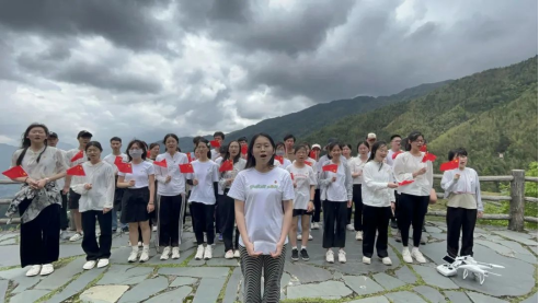 活动中同学们在龙脊梯田观景平台上迎风挥舞着五星红旗,共同唱响歌曲《我和我的祖国》和《光荣啊,中国共青团》,将“绿水青山就是金山银山”思想和“传承红色基因,弘扬党的二十大精神”主题贯穿到专业野外实习的各个环节。