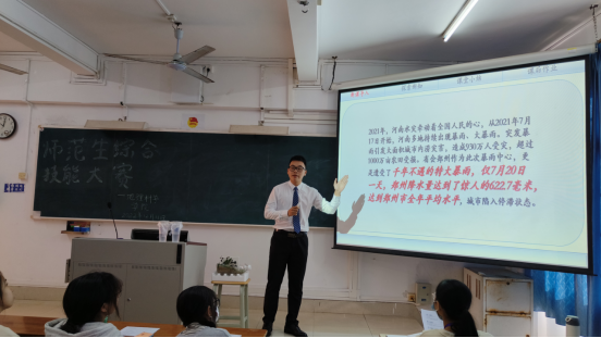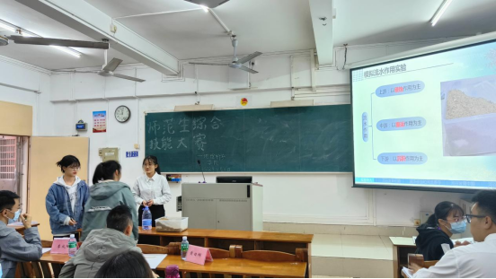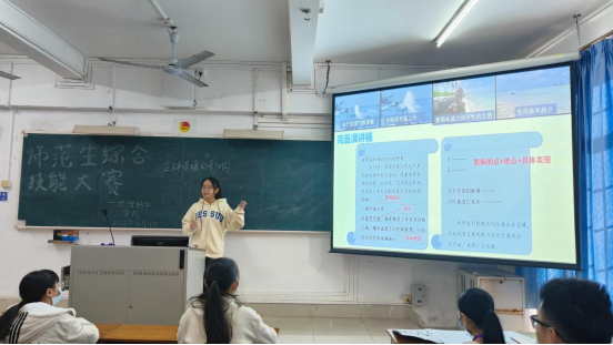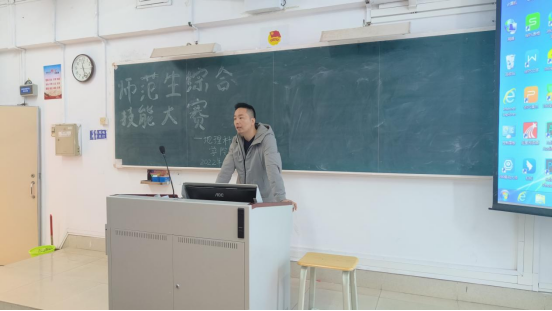 在初赛阶段,各班级经过精彩角逐,最终确定14位选手胜出,进入决赛。在决赛中,每位选手进行限时12分钟的模拟授课,比赛过程中选手们展现出了多种多样的授课方式,以日常生活中的现象、幽默风趣的对话或时下热点为开始导入课堂学习内容,以理论讲解、视频学习、实物展示、课堂实验等多种方式对授课内容进行讲解,使复杂的知识内容简单化,更容易被学生所理解和接受。同时,选手们从自身的专业特点与地理学科的核心素养出发,注重教学方式的灵活多变,给我们带来了一场场精彩的课堂教学。
