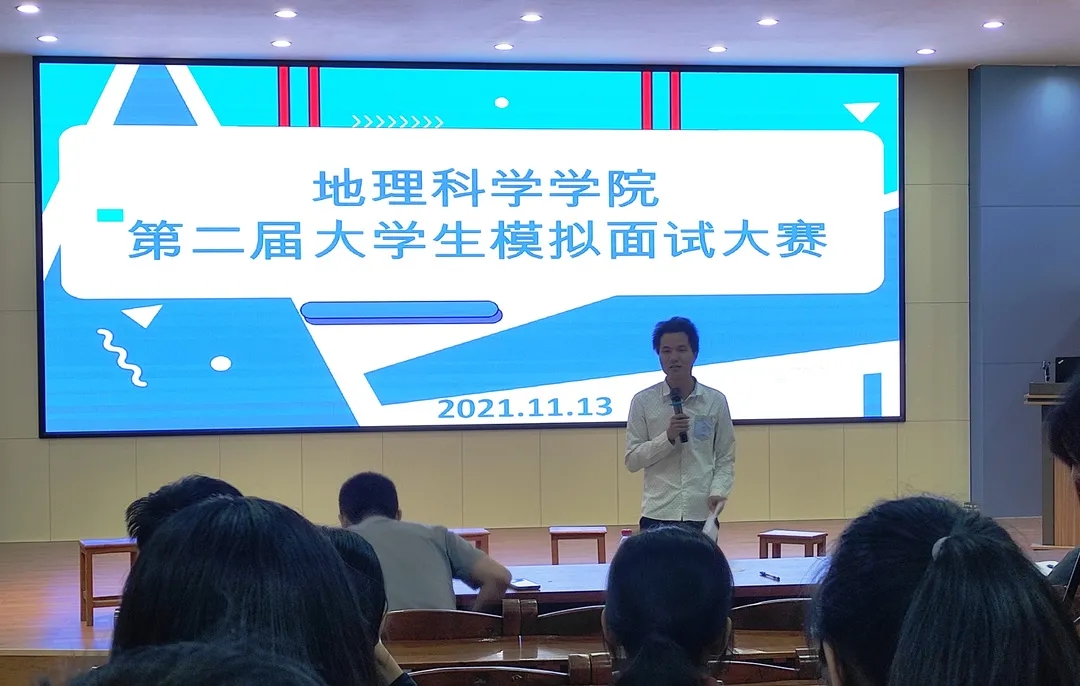 11月13日,地理科学学院邀请供职于湛江培才一中的11级校友莫济贵老师担任第二届大学生模拟面试大赛评委并做专题讲座。莫济贵校友近期新获得第三届湛江市中小学青年教师教学能力大赛地理组一等奖。