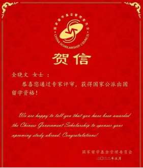 全晓文开心地说:“我特别感谢学校良好的学术氛围,让我萌生了要出国留学的想法。我也感谢老师一直以来对我的悉心指导,让出国留学从一个看着‘遥不可及’的想法逐步变成‘近在眼前’的现实。”谈到申请出国留学,她建议师弟师妹:“第一,穷且益坚,不坠青云之志。希望大家考研的时候尽量选择高水平的院校,申请国外学校的时候尽量申请世界排名500名之内的院校。所谓的“国家建设高水平大学公派研究生项目”就是从高水平的院校选拔学生到高水平的大学留学。第二,天行健,君子以自强不息。各个学习阶段的成绩都特别重要,不仅仅是研究生阶段的,本科期间的成绩也是考核的标准之一,所以希望大家都要努力掌握各阶段的知识。第三,凡事预则立,不预则废。明确出国留学深造目标后,要尽早通过雅思托福考试,有助于提升申请出国留学的竞争力。第四,博观约取,厚积薄发。研一、研二阶段多参加项目、多发表文章和申请专利等等,因为文章、项目等都是个人能力的体现,这是非常重要的“硬件”条件。最后,非常重要的一点是认真写好研究计划,切实可行的研究计划很大程度上决定了CSC的成功与否。”
