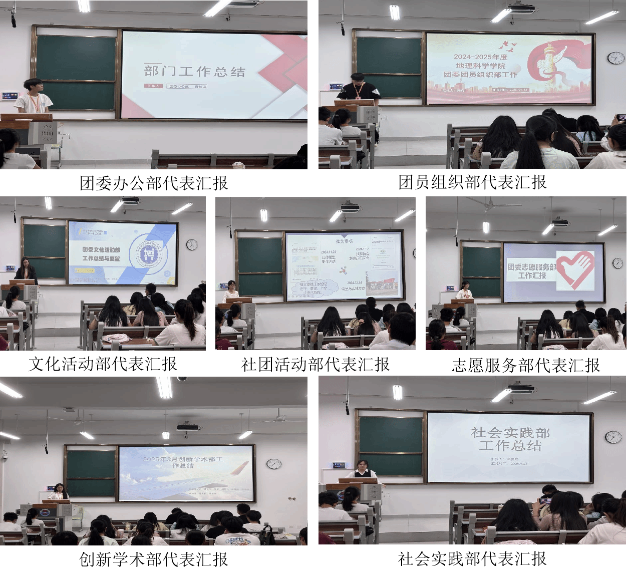 议程二:各部门依次进行工作汇报。团委七大部门各派代表,对上学期的工作内容和经验进行总结和汇报,反思上学期的工作不足,对新学期的工作做出规划和展望。