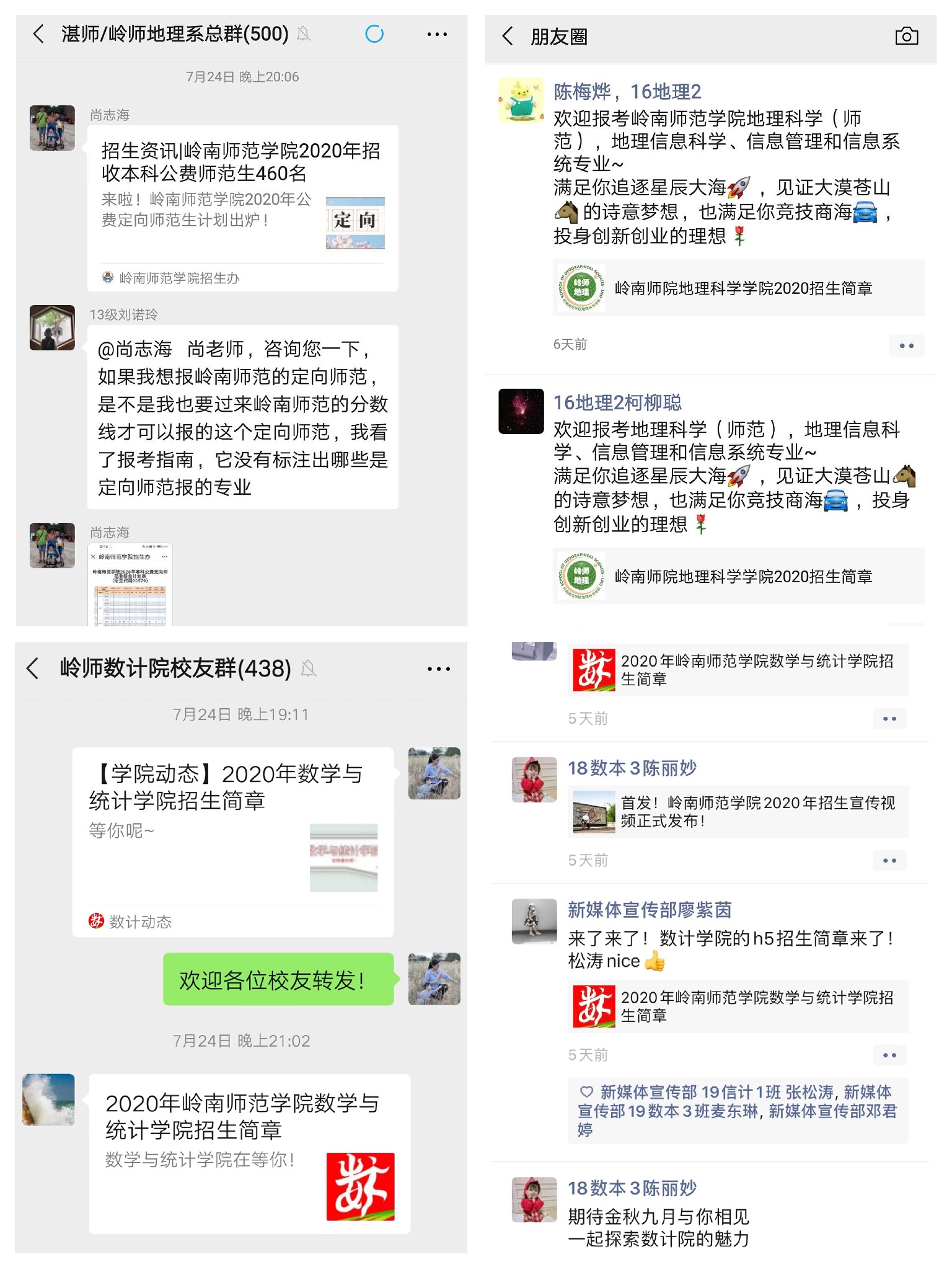 招生成效是作为检验办学实力、品牌效应的重要指标。地理学院和数计学院高度重视招生宣传工作,两院党委统筹领导,创新谋划,以招生工作为主线,以就业调研和校友工作为辅,线上搭建起以学院官网、微信公众号为主导,学院QQ、微信工作群、各师生朋友圈、校友群集中转发、互动、宣传的“云招生”格局,推出H5视频、推文等学生家长喜闻乐见的新媒体产品,多维度、全视角推送学校和学院简介、专业介绍以及2020年招生政策、计划。线下则积极联动各地校友会、中小学,通过招生见面会、校友座谈会等形式,精准“点对点”宣传学校招生计划和办学成效,提高了宣传工作的便捷性和成效。以上举措有力、全面发挥了宣传引导作用,努力画好线上线下招生宣传同心圆。