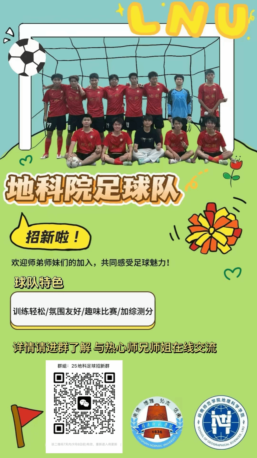 亲爱的2025级地理人,又到了一年一度的招新季节,我们地理科学学院足球队也开始招新啦!无论你是有着多年足球经验的老手,还是刚刚开始接触足球的新手,我们都欢迎大家来到我们地科院足球队!无论你是否有足球基础,只要你对足球充满热情和渴望,我们都热切期待你的加入。