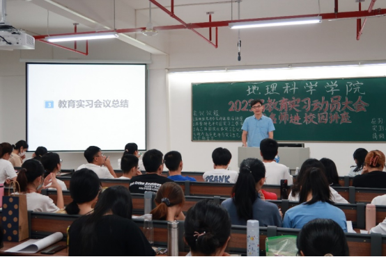 2022年5月30日晚上,地理科学学院在教五A-412召开2023届教育实习动员大会暨名师进校园讲座。大会邀请了遂溪县教研室陈秋跃老师作“踏实习征程、展青春风采”专题讲座。会议由陈碧珊老师主持,尚志海副院长、全体校内指导老师及2019级地理科学专业全体学生参加会议。
