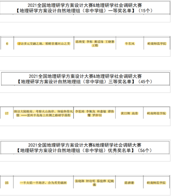 2022年3月中旬,“2021全国地理研学方案设计大赛”结果公布,岭师地理科学学院喜获佳绩。3支参赛队伍分别获得自然地理组一等奖、三等奖和优秀奖,牛东风老师荣获优秀“指导老师”,地理科学学院荣获“优秀组织奖”。