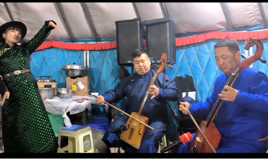 用餐过程中,三位蒙古族艺术家为我院师生献上精彩的民族表演。蒙古族马头琴名曲《万马奔腾》震撼同学们的心弦,还有非物质文化遗产“呼麦”,让同学们感受到蒙古族音乐的独特魅力。最后,为感谢蒙古族同胞的盛情款待,22地理2班李彦玥带领同学们合唱歌曲《海阔天空》,来自中国大陆最南端的粤语歌与内蒙古马头琴的碰撞,共同演绎民族大团结的华彩乐章。