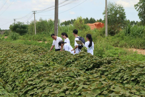图为冼祥农先生带领“收藿优品”乡村振兴促进团队员们实地调研广藿香大田