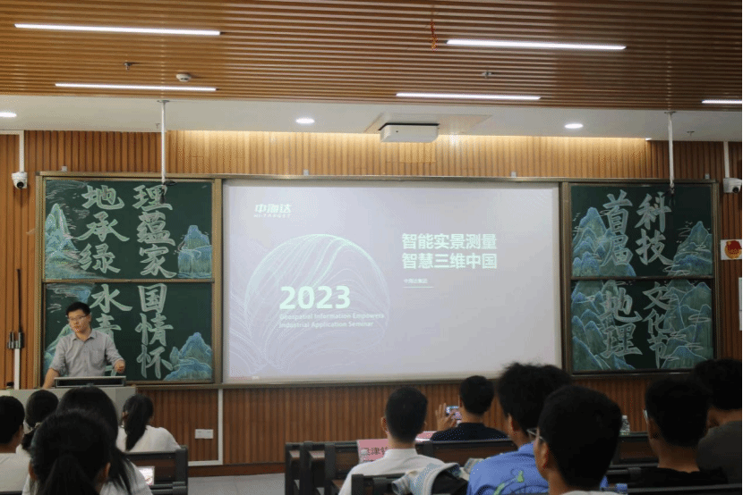 随后,马彬介绍了中海达集团在各种项目中所使用的主要技术,包括地形级、城市级、道路部件实景三维采集及建模、道路部件普查自动化提取算法、地下空间实景三维采集、大比例尺地形测绘等技术手段。他以丰富的实践经验概括性地讲解了各个技术的实施方案、技术难度、方案特点和其对应项目的具体需求,让同学们拓展了专业视野和提升了专业素养。