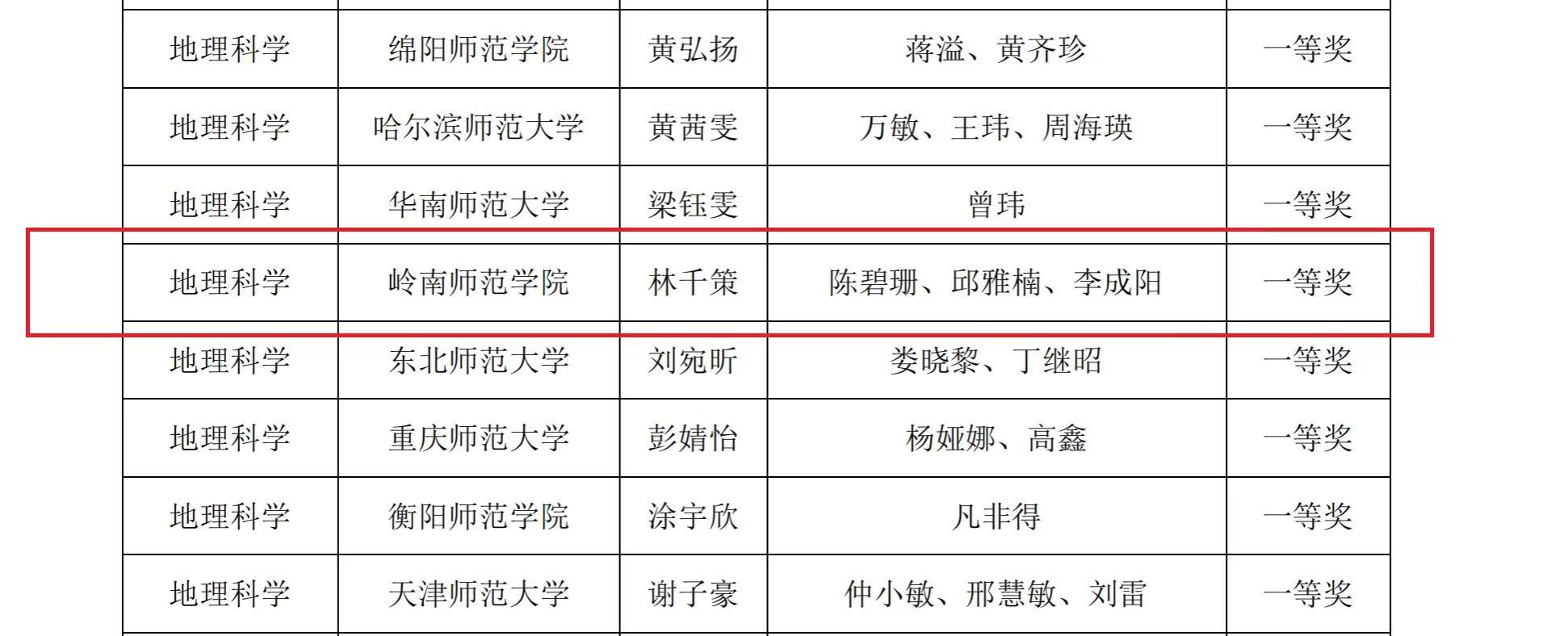 本次竞赛由全国地方高等师范院校教务处长联席会主办、浙江师范大学承办,来自全国226所高校的1611名优秀本科师范生各展风采,展开一场高水平的较量。比赛规定每校每个组别仅推荐1名参赛选手,地理组有华东师范大学等百余所高校参加初赛。地科院2020级地理科学专业林千策同学在陈碧珊、邱雅楠、李成阳等教师的悉心指导下,经过初赛严格选拔成功入围决赛,并在与东北师范大学等33所高校地理科学专业选手同台竞赛中凭借出色表现荣获了地理科学组一等奖,实现了我校地理科学专业在该项赛事中零的突破。