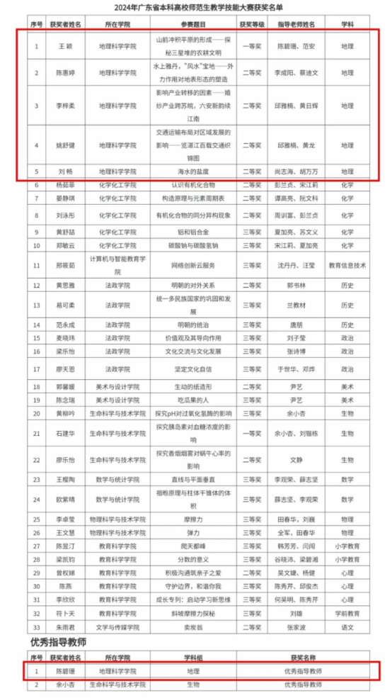 根据《广东省教育厅关于公布2024年广东省本科高校师范生教学技能大赛获奖名单的通知》(粤教高函〔2025〕6号)文件,在2024年广东省本科高校师范生教学技能大赛中,我院陈碧珊老师荣获优秀指导教师奖,王颖同学荣获地理学科一等奖,陈惠婷、李梓柔、姚舒健和刘畅荣获地理学科二等奖。