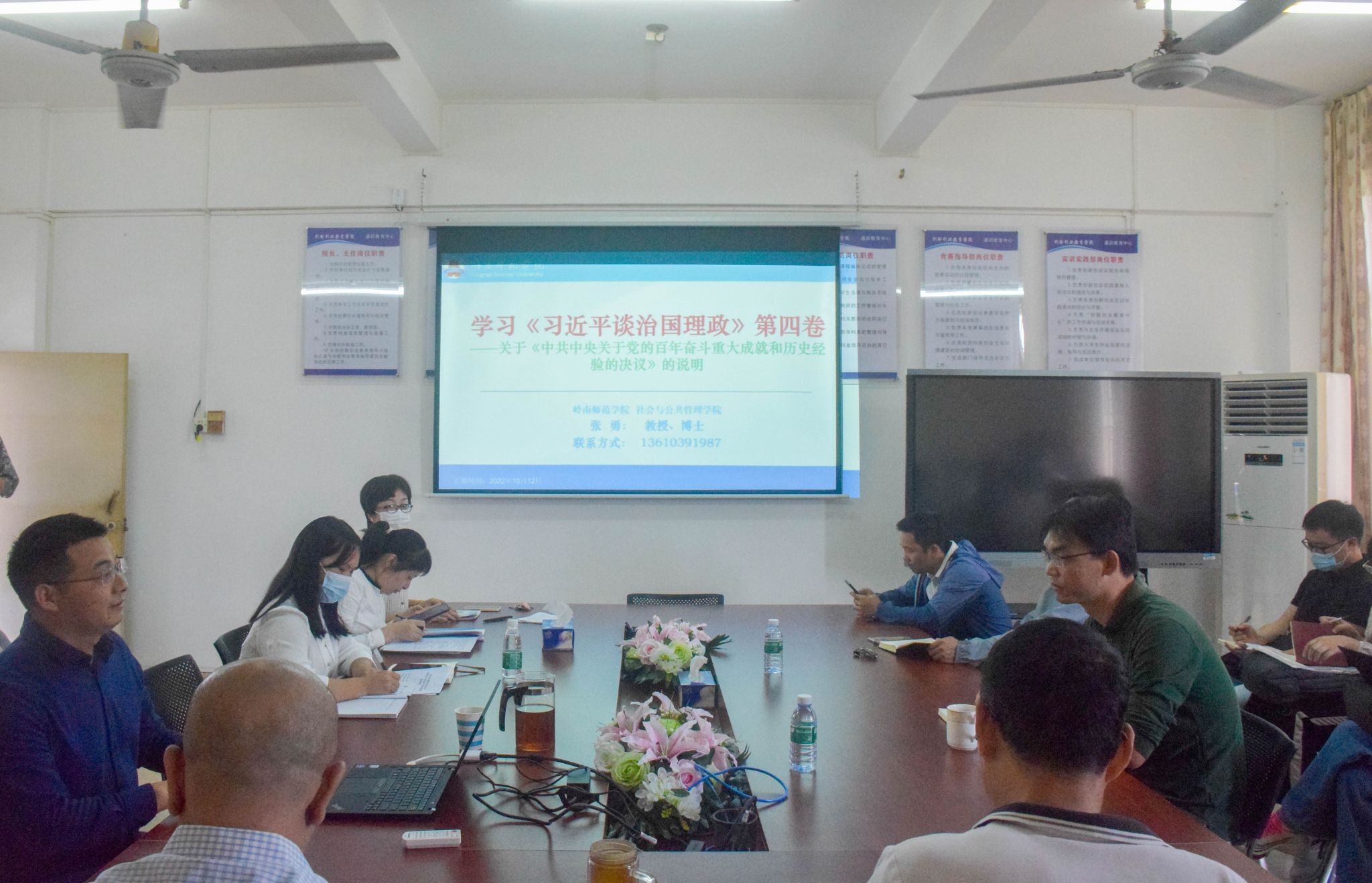 10月12日下午,地理科学学院于第二教学楼301会议室召开《习近平谈治国理政》第四卷专题宣讲会,本次会议由地理科学学院党委书记全柱主持,社会与公共管理学院张勇教授主讲,地理科学学院全体教职员工参加。