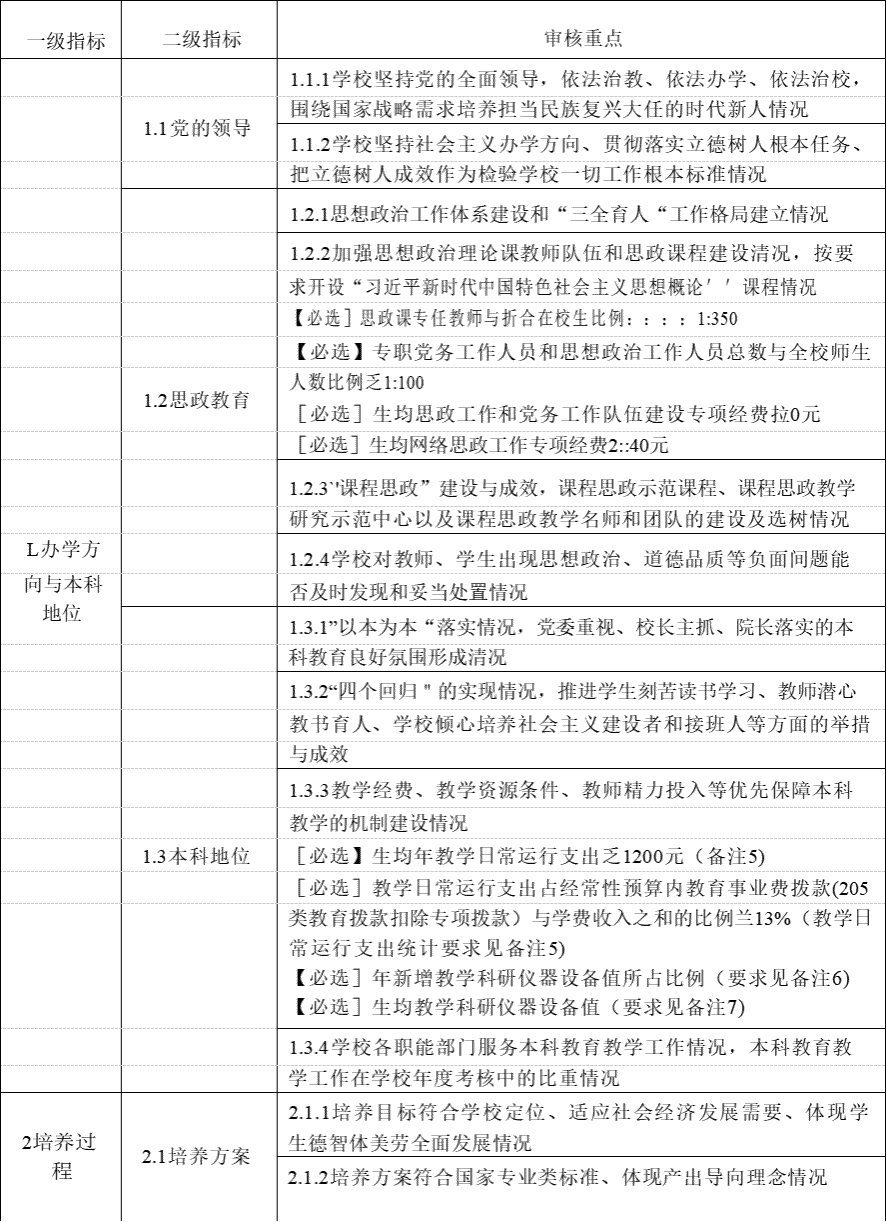 2. 二级指标和审核重点包括统一必选项、类型必选项、特色可选项、首评限选项。一一“统一必选项“无特殊标识,所有高校必须选择;__,'类型必选项''标识”B"'选择第一种的高校须统一选择“Bl",选择第二种的高校须统一选择“B2";选择第三种的高校原则上选择“B2";一“特色可选项“标识”K"'高校可根据办学定位和人才培养目标自主选择,其中:第一种与"Kl”选项对应,第二种与“K2“选项对应;第三种原则上与',K2"选项对应;“首评限选项“标识”X"'选择第三种的高校必须选择,其他高校不用选择。