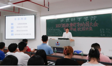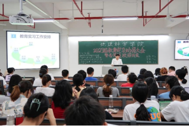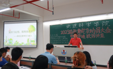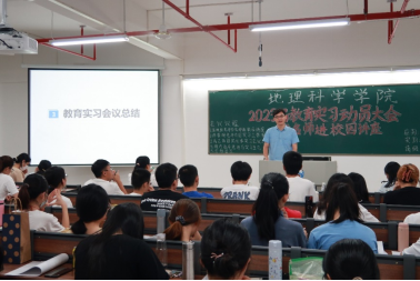 2022年5月30日晚上,地理科学学院在教五A-412召开2023届教育实习动员大会暨名师进校园讲座。大会邀请了遂溪县教研室陈秋跃老师作“踏实习征程、展青春风采”专题讲座。会议由陈碧珊老师主持,尚志海副院长、全体校内指导老师及2019级地理科学专业全体学生参加会议。