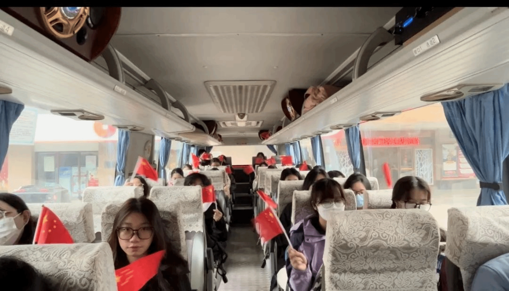随后,在返回的途中,同学们在车上交换了刚刚参观两面针公司后的心得体会,同时挥舞着手中的红旗,唱起了爱国歌曲《歌唱祖国》。
