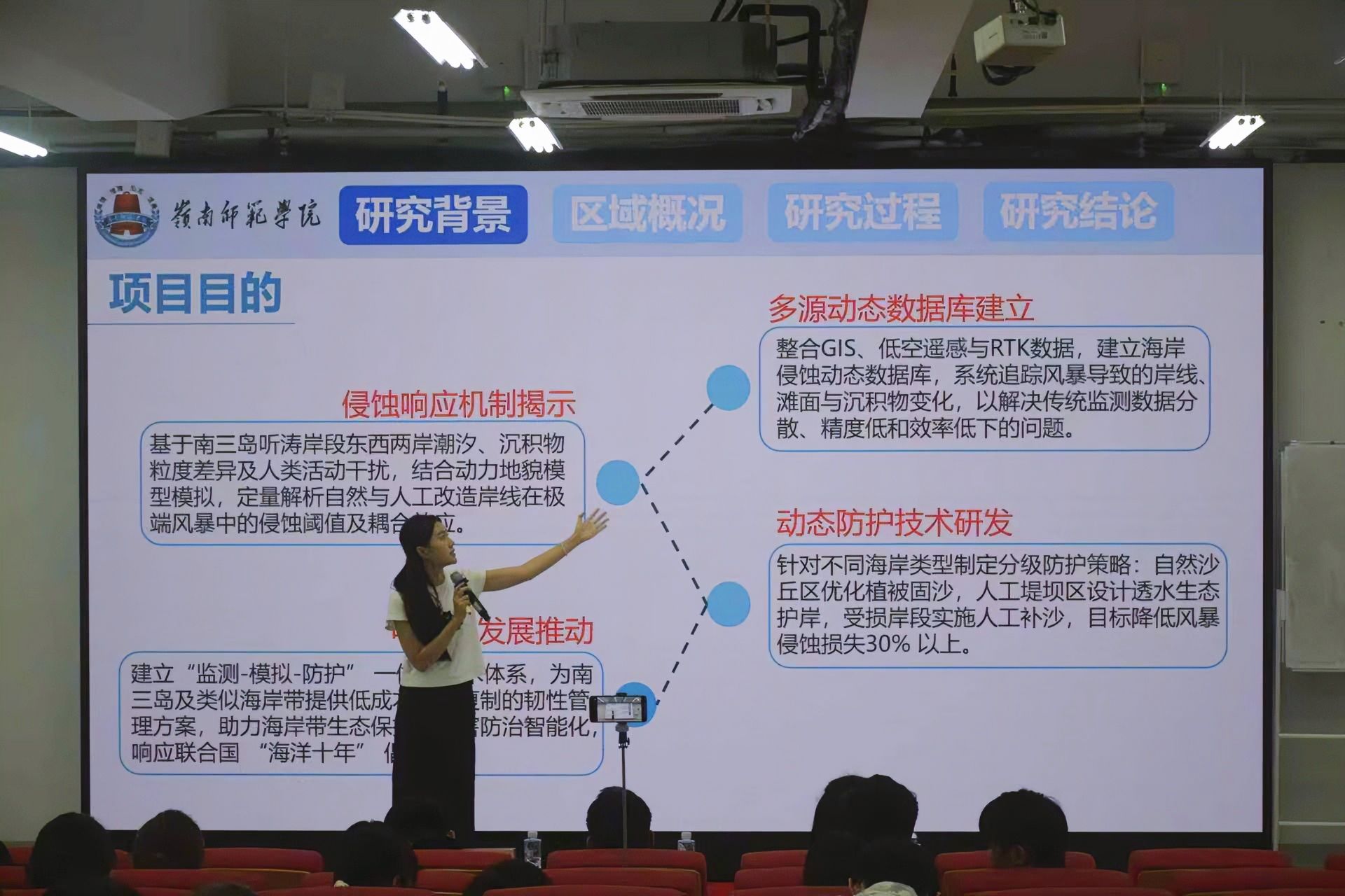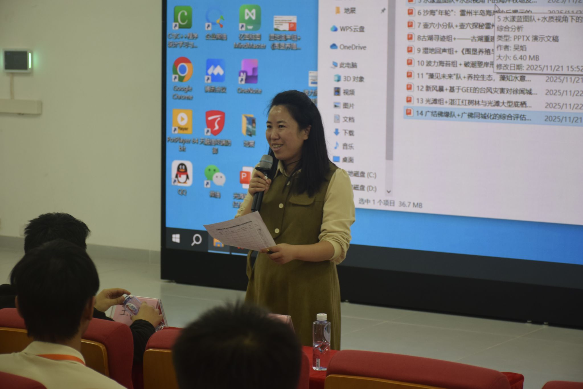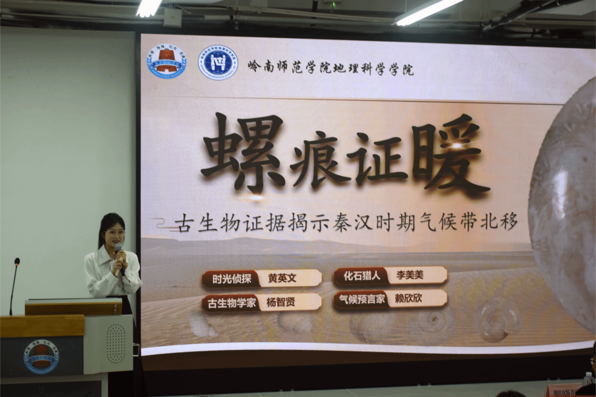 大赛自启动以来,吸引了地理科学与地理信息科学专业同学们的踊跃参与,共收到30余支队伍报名参赛。经过初赛选拔,14支优秀队伍脱颖而出,晋级决赛。各参赛队伍紧扣主题、聚焦内涵,围绕地理科学的多个前沿领域展开了精彩展示:“螺痕证暖”组通过古生物证据揭示秦汉时期气候带的北移现象;“壶穴小分队”聚焦雷州半岛流牛滩的玄武岩壶穴研究;“古湖寻迹”组探讨了古湖重建与土地资源适宜性利用;“湿地回声”组关注围垦养殖与退塘还湿对红树林湿地土壤铁结合有机碳的影响;“波力海苔”组分析了极端风暴下雷州半岛不同类型海岸的侵蚀差异;“新风暴”组则基于GEE平台,以台风“摩羯”为例评估了徐闻城市的灾害韧性……选手们通过PPT讲解、情景模拟等多种形式,生动呈现了地理科学的广度与深度。