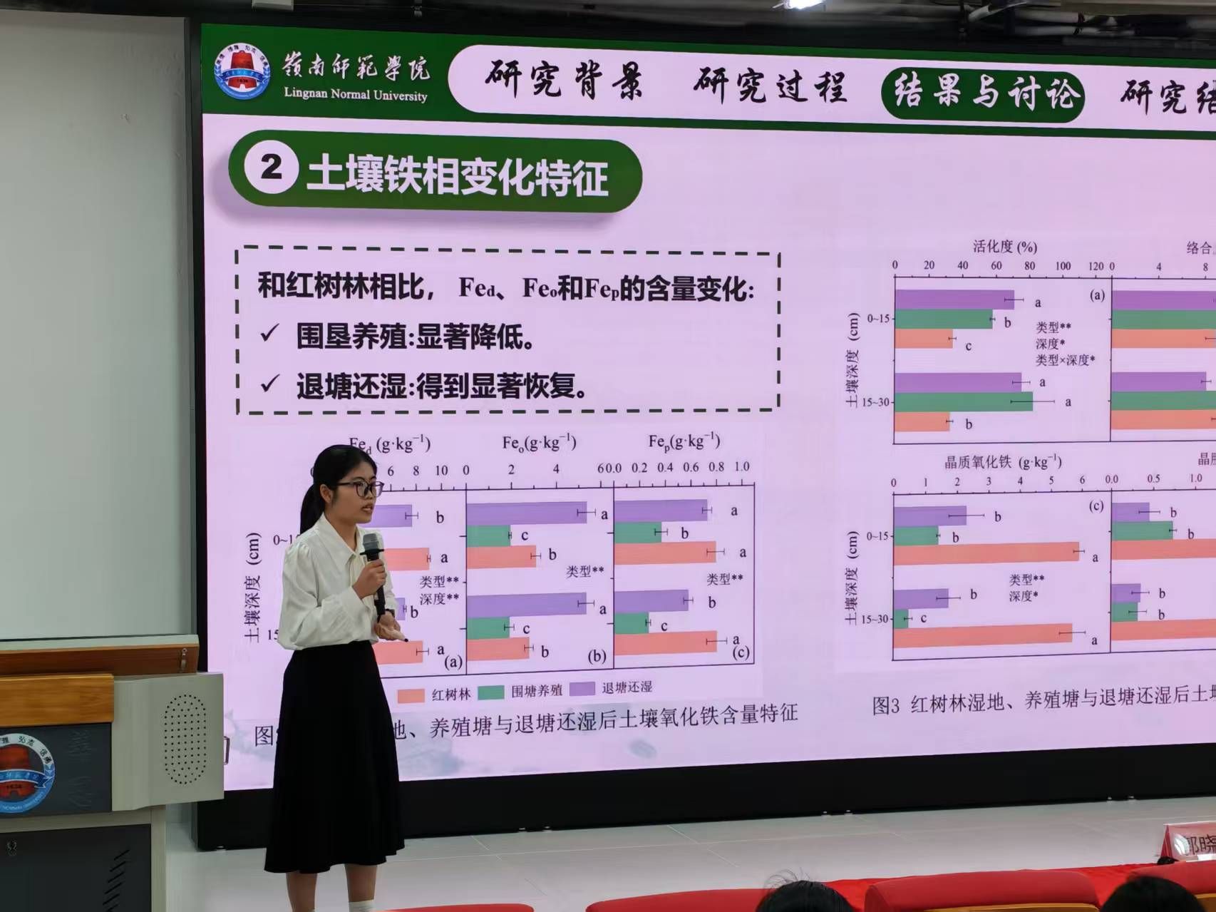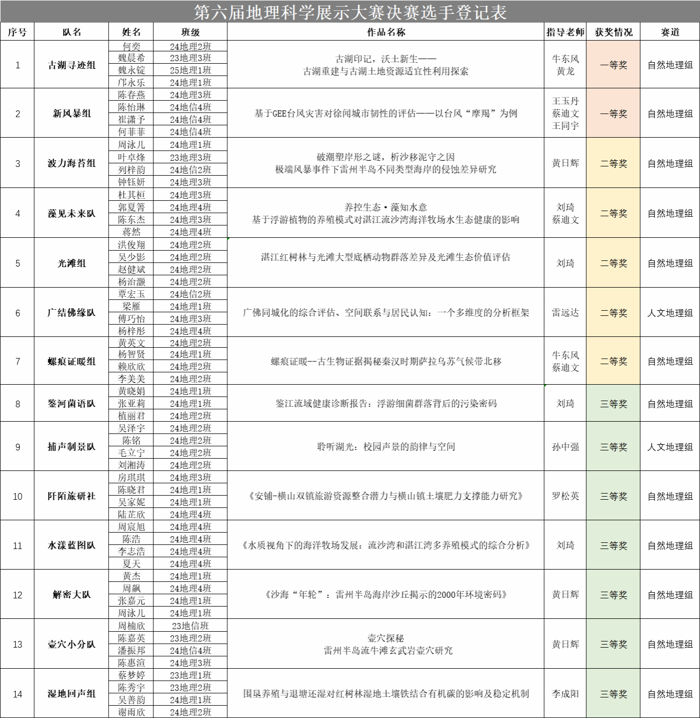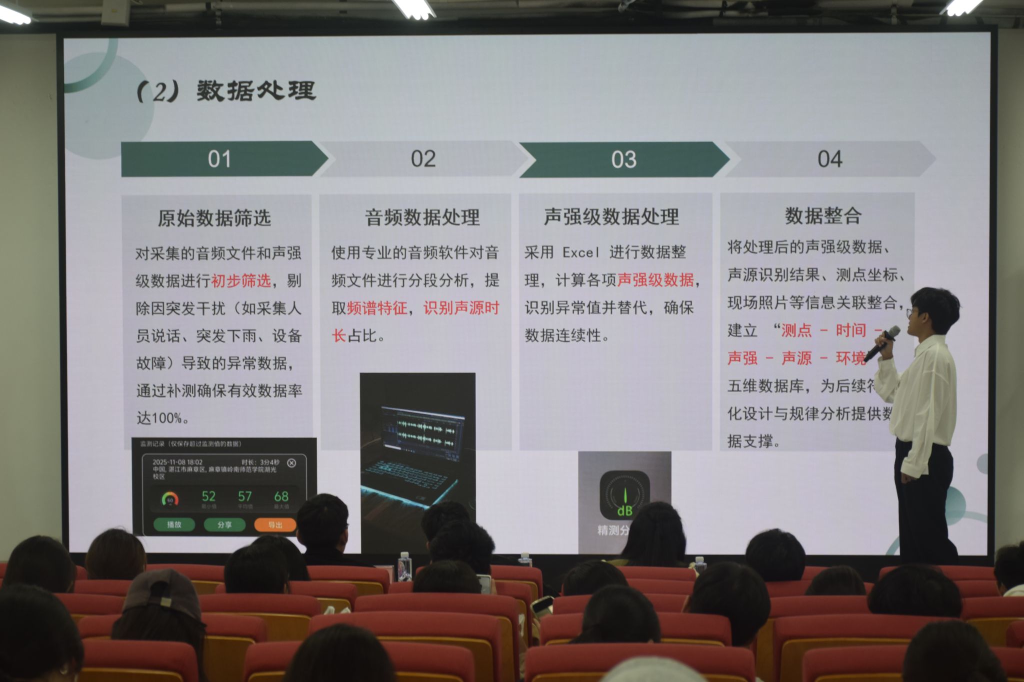 大赛自启动以来,吸引了地理科学与地理信息科学专业同学们的踊跃参与,共收到30余支队伍报名参赛。经过初赛选拔,14支优秀队伍脱颖而出,晋级决赛。各参赛队伍紧扣主题、聚焦内涵,围绕地理科学的多个前沿领域展开了精彩展示:“螺痕证暖”组通过古生物证据揭示秦汉时期气候带的北移现象;“壶穴小分队”聚焦雷州半岛流牛滩的玄武岩壶穴研究;“古湖寻迹”组探讨了古湖重建与土地资源适宜性利用;“湿地回声”组关注围垦养殖与退塘还湿对红树林湿地土壤铁结合有机碳的影响;“波力海苔”组分析了极端风暴下雷州半岛不同类型海岸的侵蚀差异;“新风暴”组则基于GEE平台,以台风“摩羯”为例评估了徐闻城市的灾害韧性……选手们通过PPT讲解、情景模拟等多种形式,生动呈现了地理科学的广度与深度。
