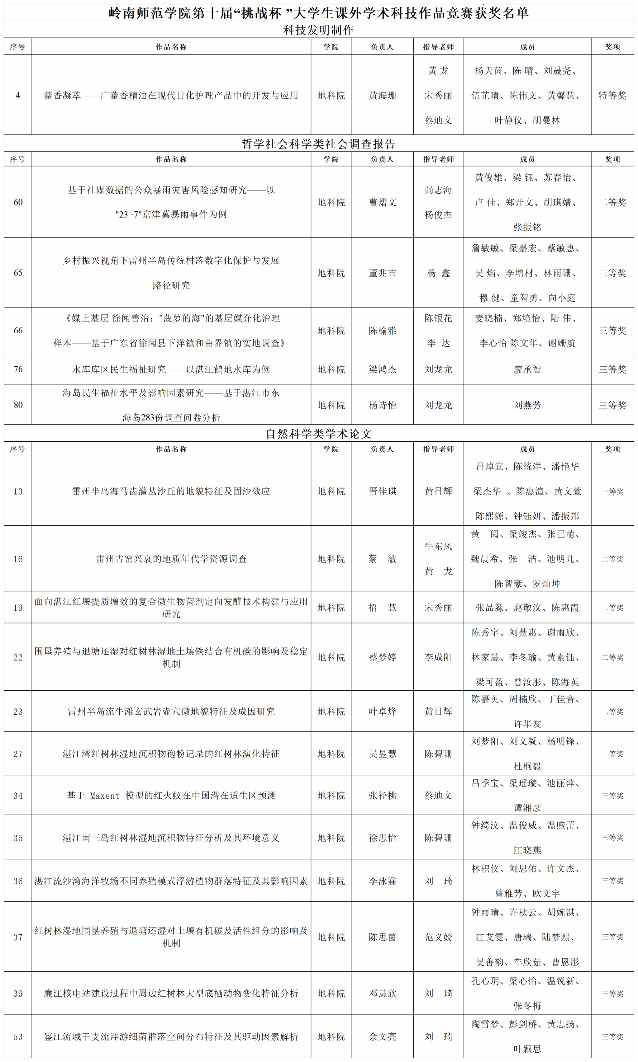 根据《岭南师范学院关于表彰第十届“挑战杯”大学生课外学术科技作品竞赛优秀集体和团队的决定》(岭师团委〔2025〕76号),我院在本届竞赛中表现优异,获奖作品共18项;其中在科技发明制作类荣获特等奖1项;哲学社会科学类社会调查报告类荣获二等奖1项、三等奖4项;自然科学类学术论文类荣获一等奖1项、二等奖5项、三等奖6项!此次竞赛,展现了我院师生出色的创新实践能力。让我们再接再厉,再创佳绩!