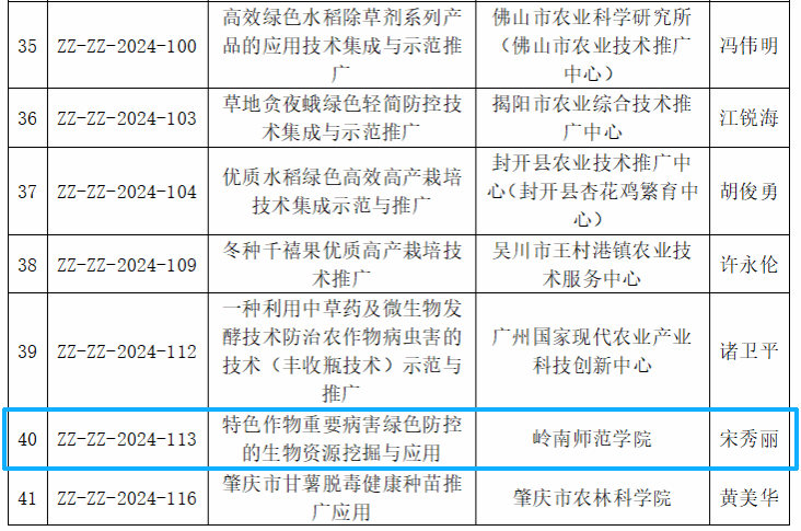 近日,2024年度广东省农业技术推广奖拟奖项目正式公示。经广东省农业技术推广奖评审委员会严格审议,我院宋秀丽老师主持的推广项目“特色作物重要病害绿色防控的生物资源挖掘与应用”荣获三等奖!