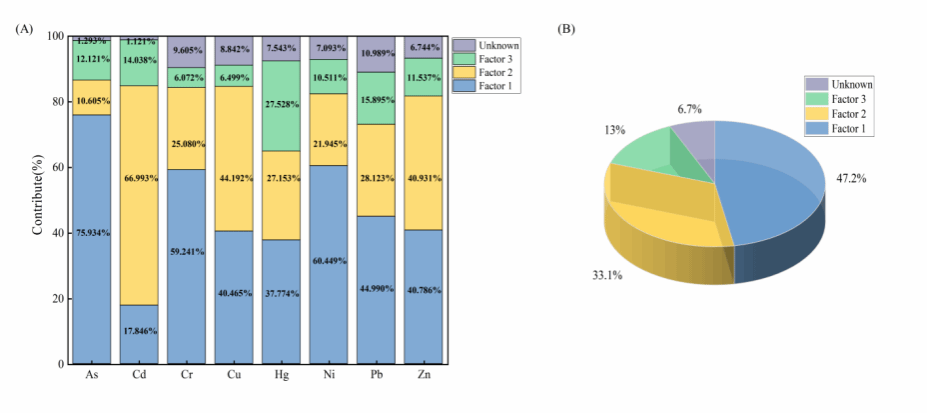 图3 各因素对重金属和砷的贡献(a)以及各因素对重金属和砷的平均贡献(B)