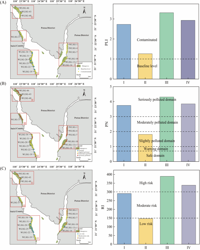 图2 五里山港红树林表层沉积物重金属和砷污染负荷指数(PLI)、内梅罗综合指数(PN)、潜在生态风险指数(RI)空间分布状况及各采样区域的平均值