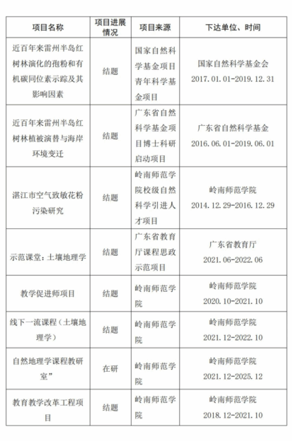主持完成国家自然科学基金项目、广东省自然科学基金项目及校级人才引进项目各1项,省级及校级教研类项目8项,发表论文16篇,参编著作2部。2022年获得广东省本科高校师范生技能大赛优秀指导老师。