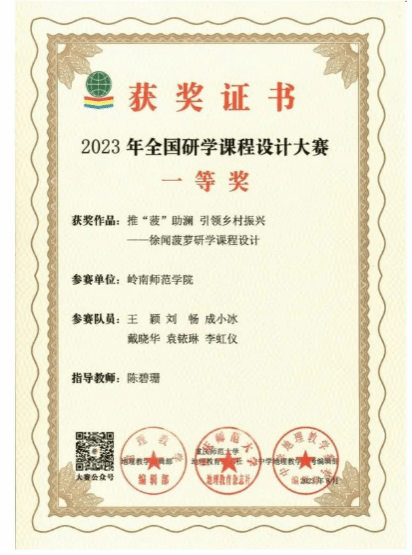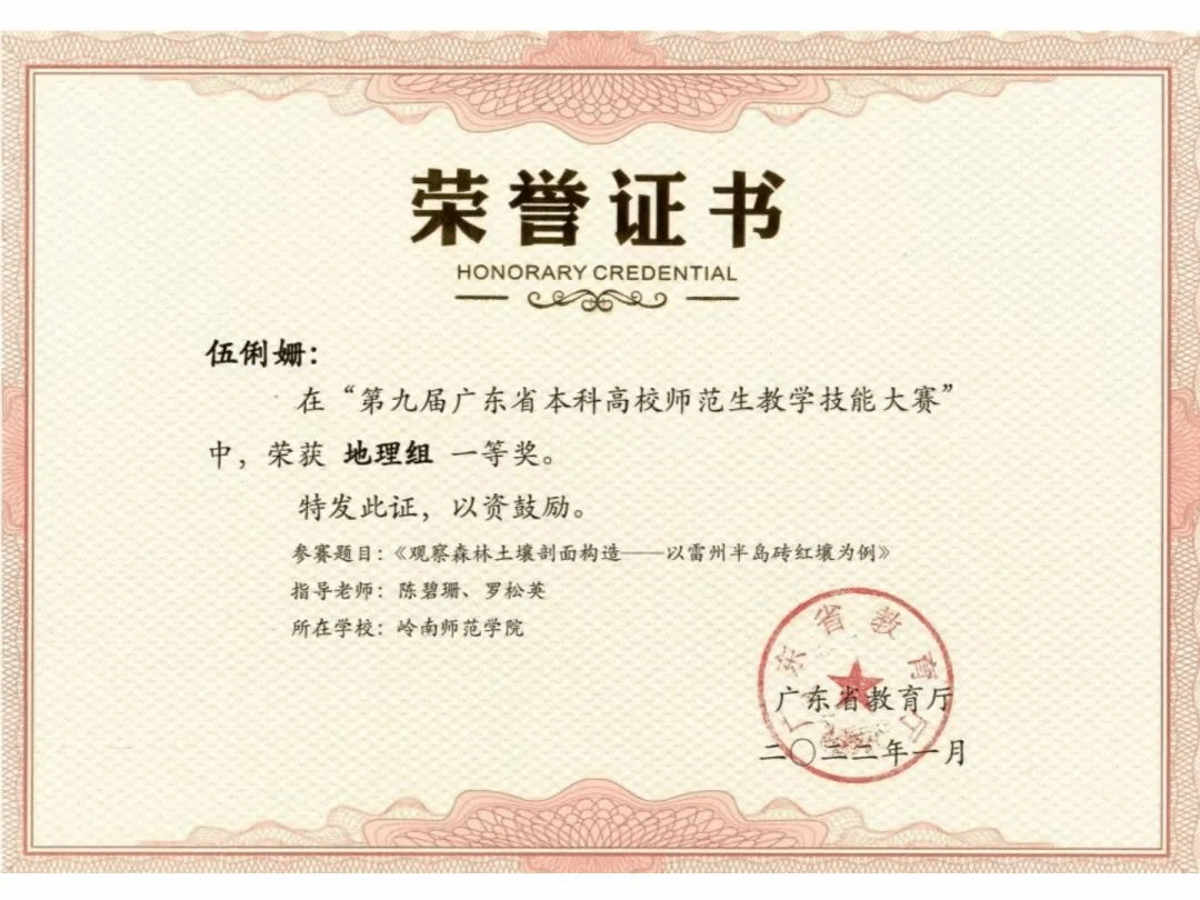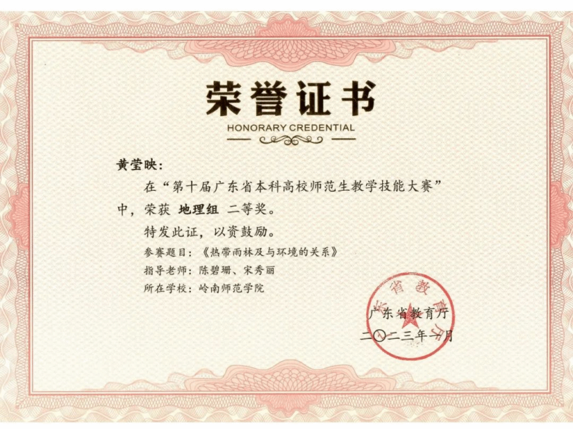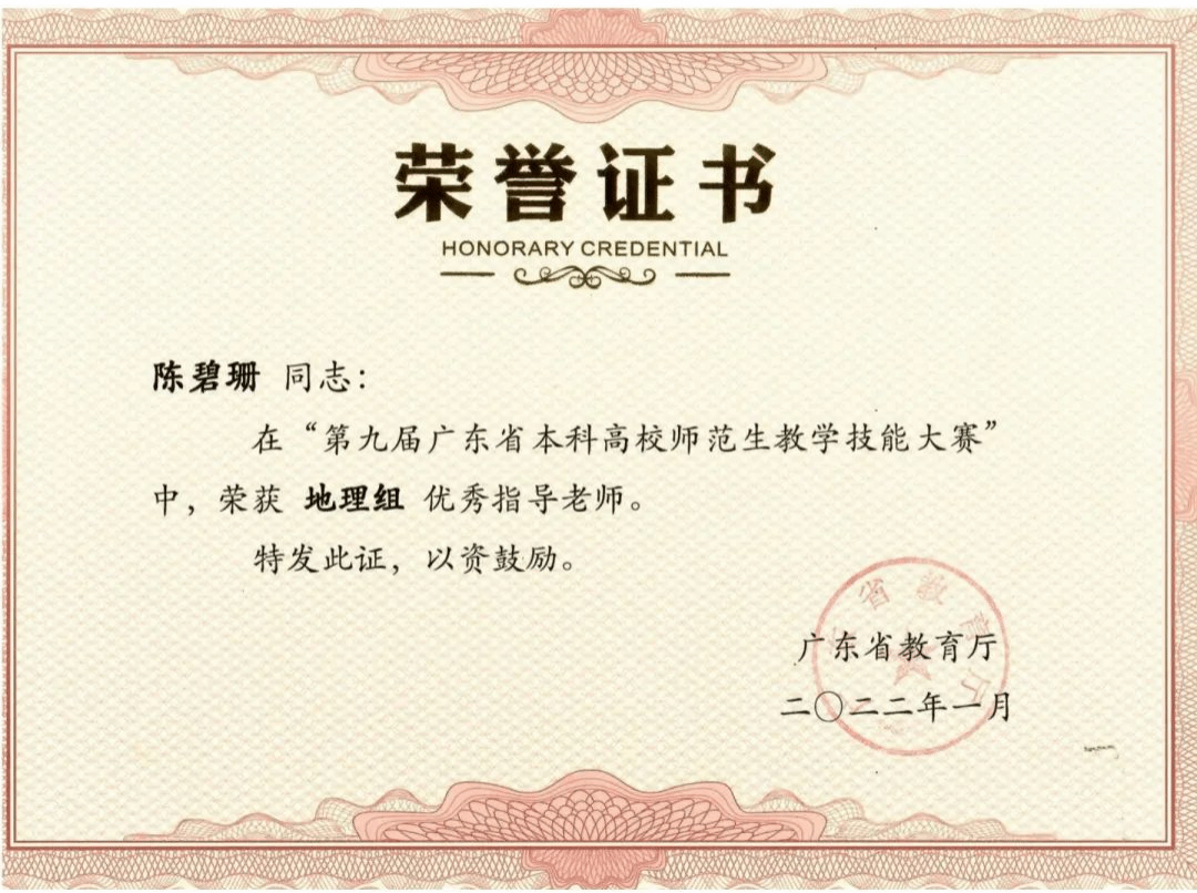 指导学生获得广东省师范生教学技能大赛一等奖、二等奖各2项;指导学生获得广东省攀登计划项目、国家级和省级大学生创新创业项目各1项;校级大学生创新创业训练计划项目5项;校级大学生挑战杯比赛三等奖2项;指导学生在“九州杯”全国研学课程设计大赛中获得全国一等奖和二等奖各4项;互联网+比赛中获得校赛铜奖1项。