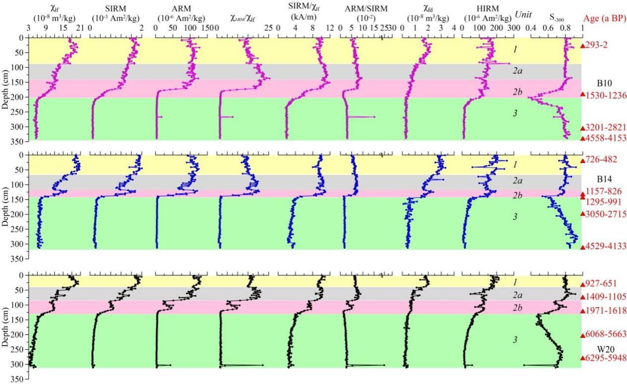 图2 磁学参数剖面变化图(1、2、3分别为亚氧化带、过渡带和溶解带)